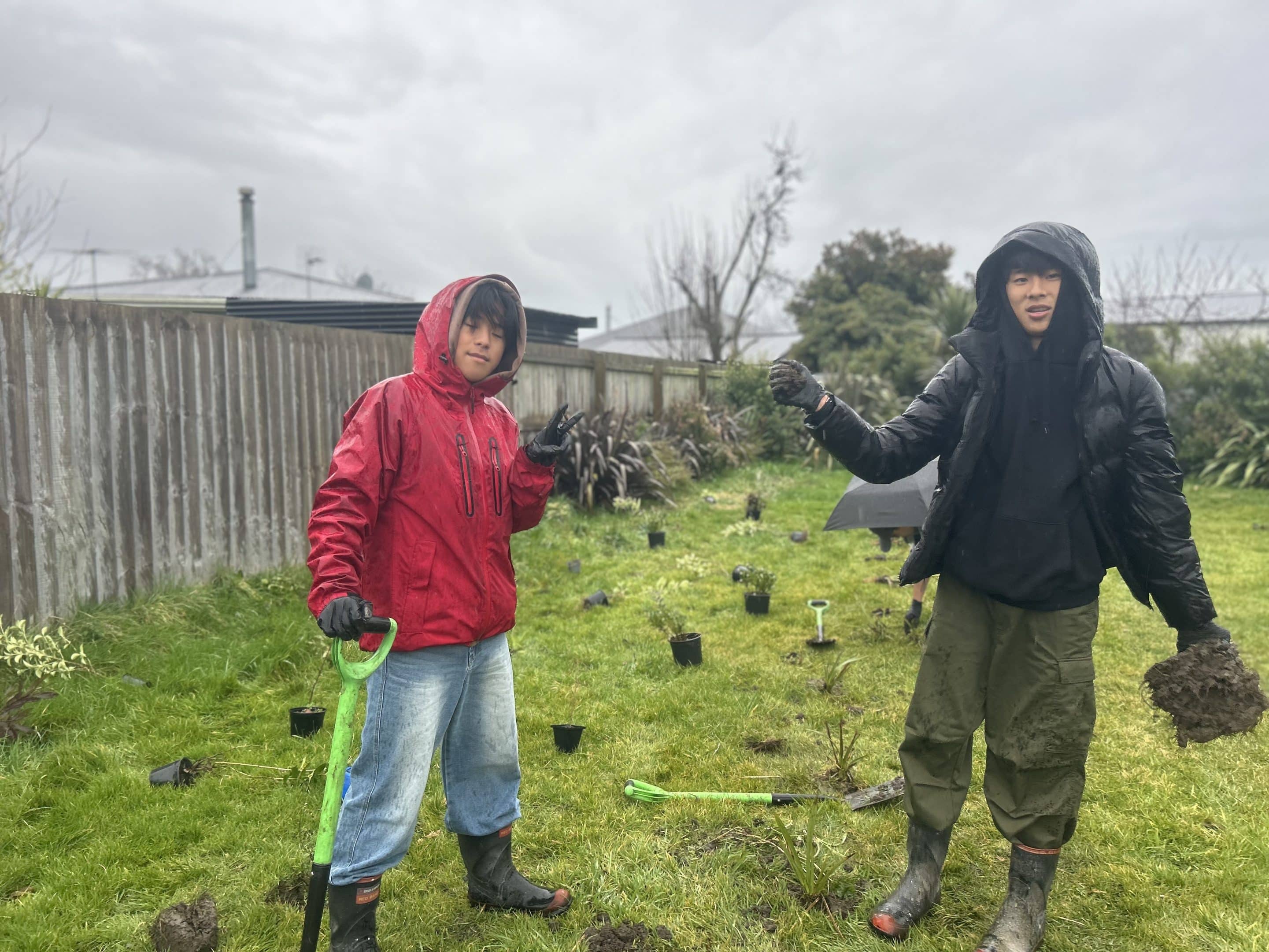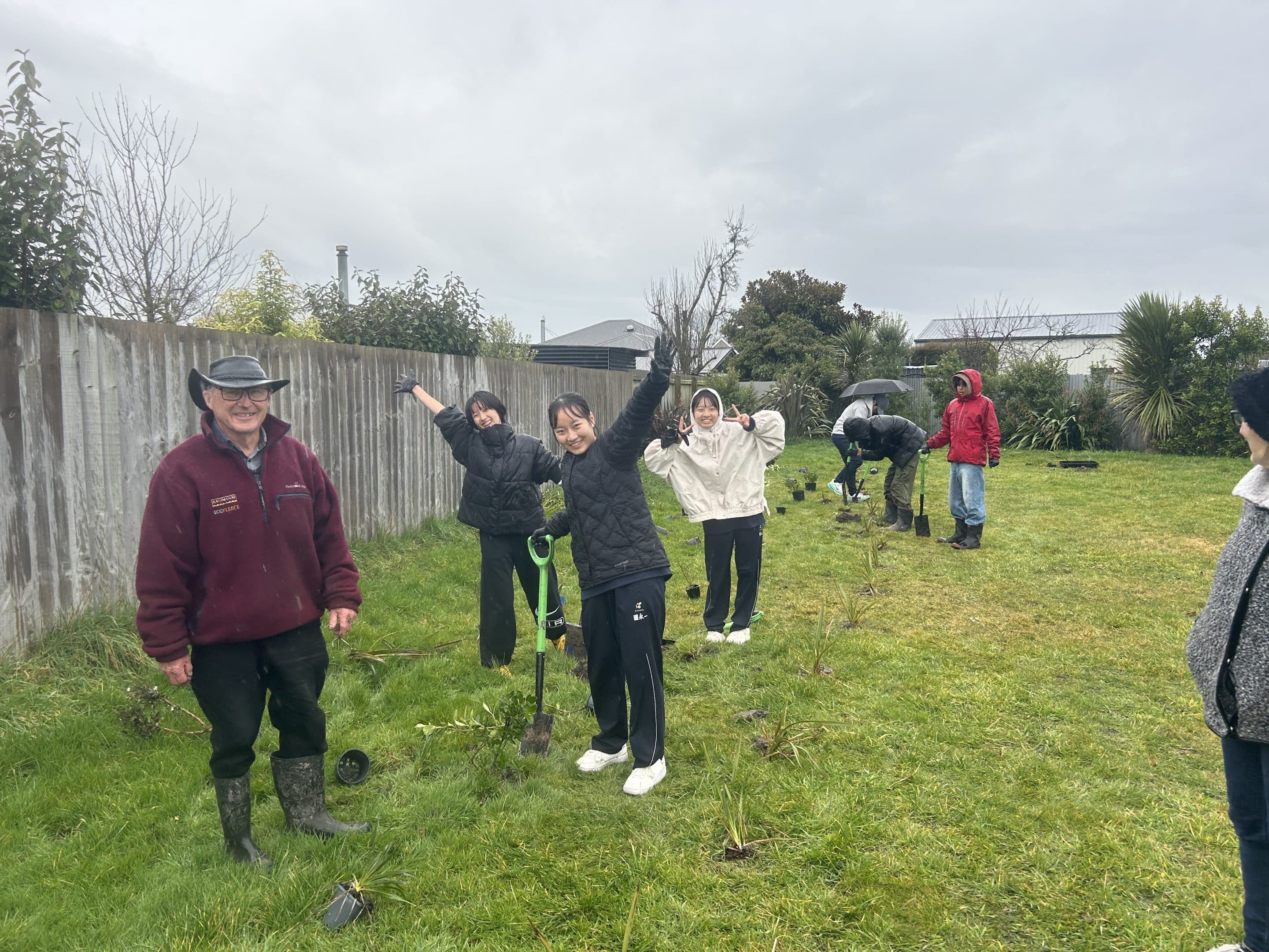 The planting day brought together students from Kaiapoi High School’s International Department, including a group of enthusiastic Japanese students eager to make a difference. With gloves on and spades in hand, participants engaged in a range of conservation activities aimed at revitalizing the Kaiapoi East Red Zone.